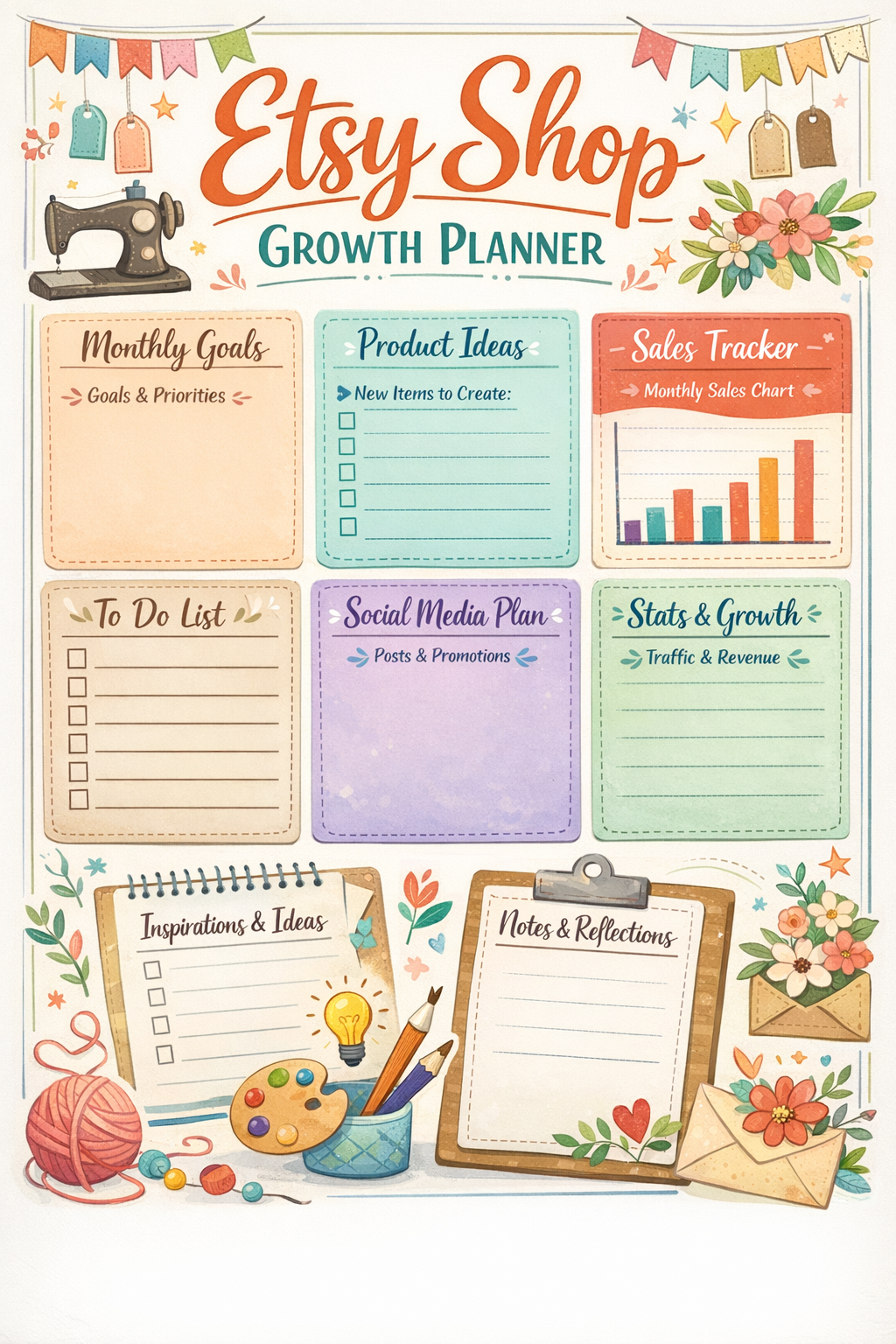 This planner features detailed sections for tracking shop performance, setting monthly goals, managing product listings, and balancing financials. Designed specifically for Etsy shop owners, it simplifies your tasks and saves you valuable time, so you can focus on what matters most—creating and selling your unique products.