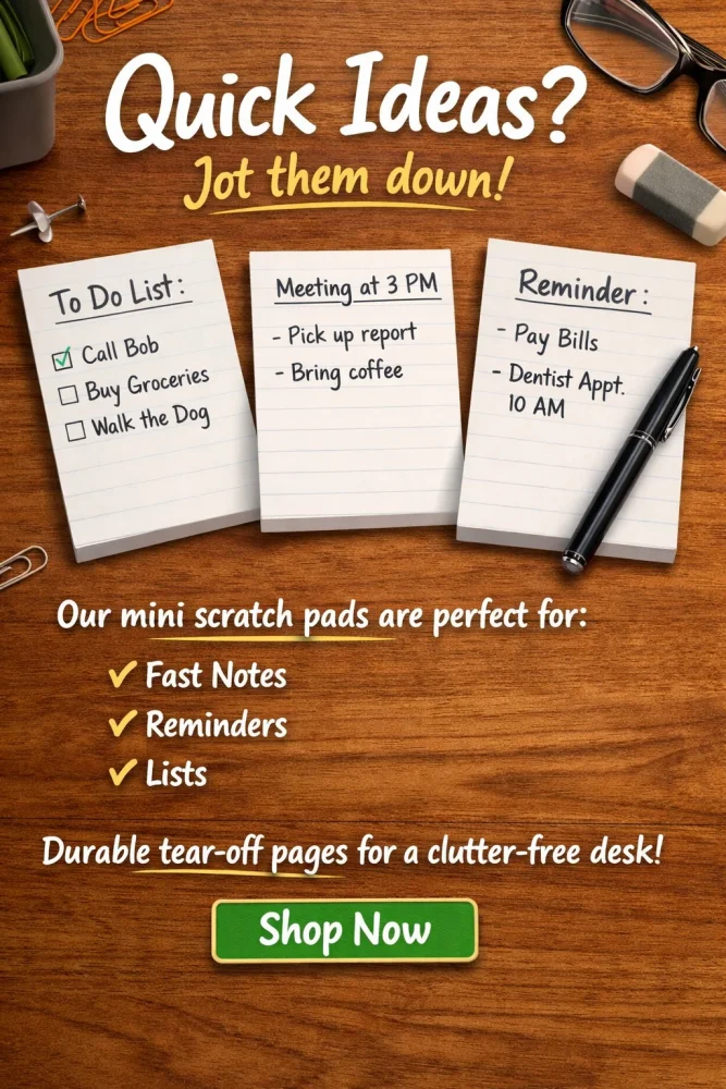 Keep your ideas organized with this premium scratch pad, designed to effortlessly capture your daily musings, reminders, and to-do lists. Ideal for home, office, or on-the-go use!